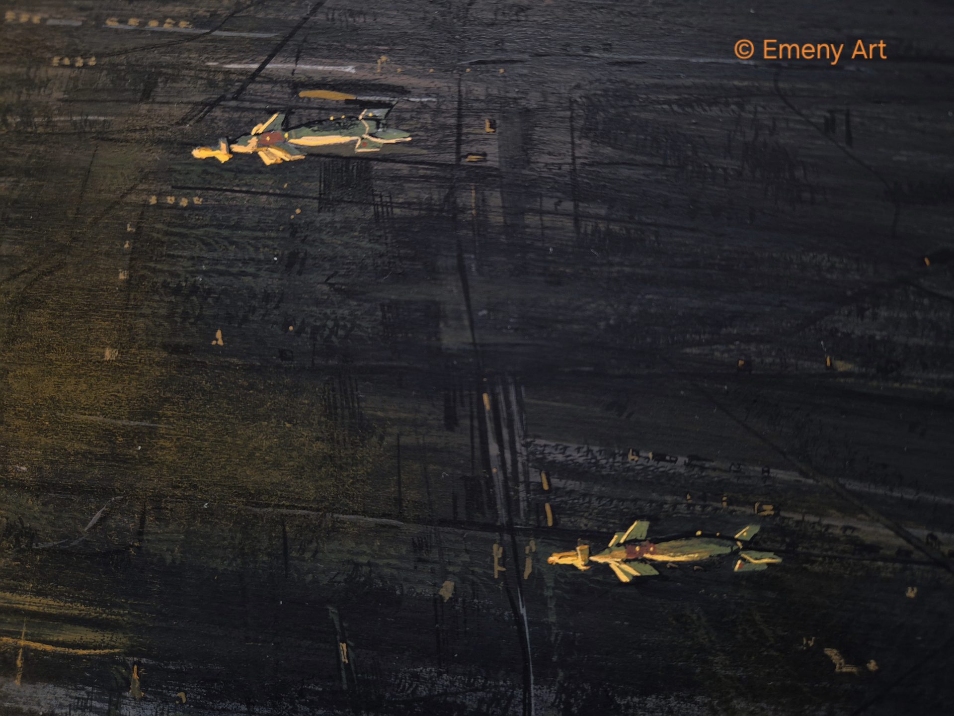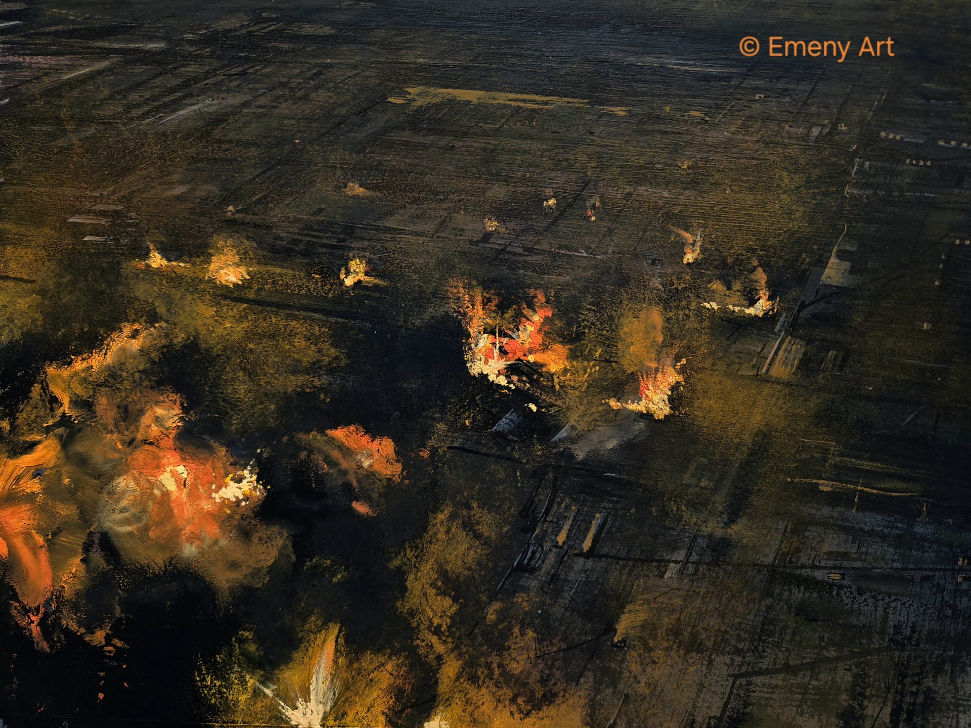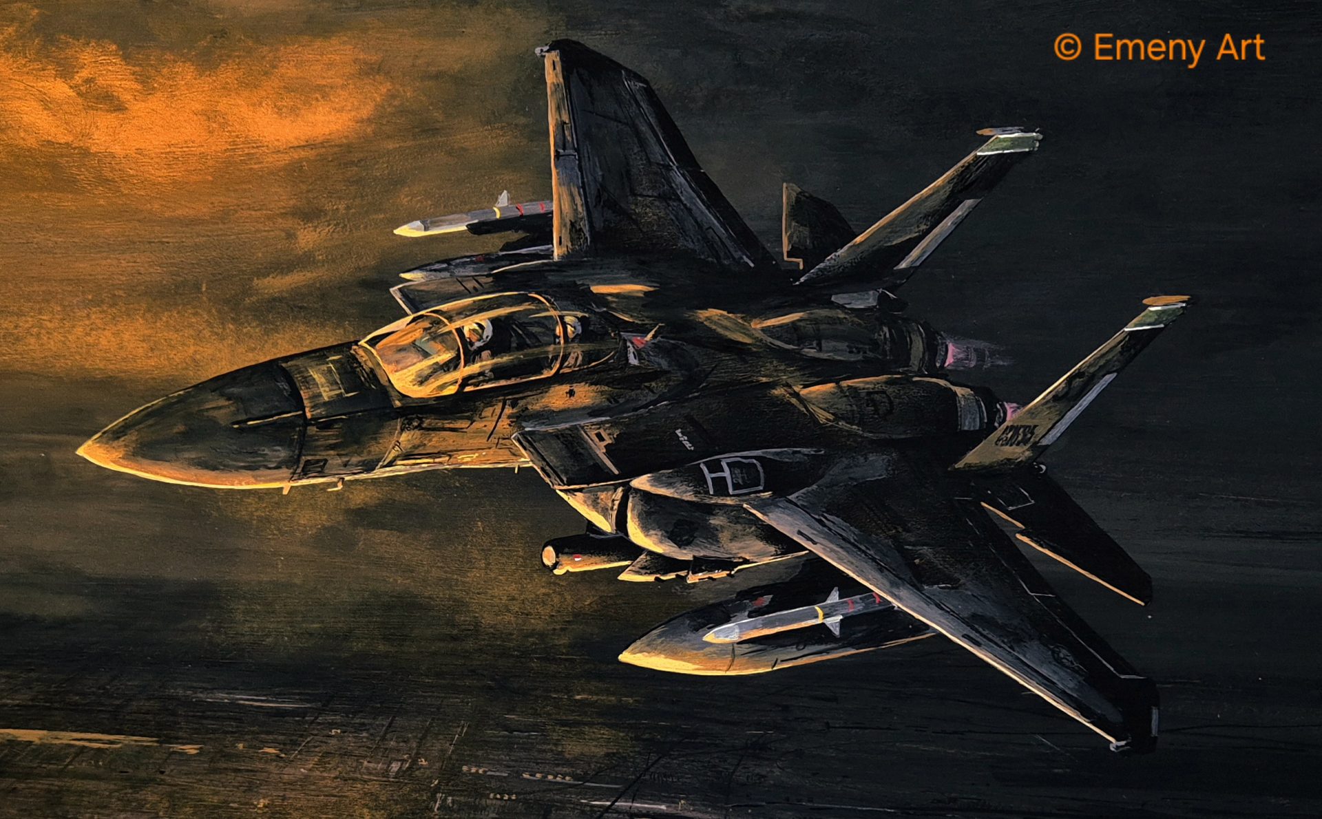 Depicting an F-15E from 335th Fighter Squadron "CHIEFS" during Operation Iraqi Freedom. This particular Strike Eagle was the last to release its GBU-12s on ammunition storage facilities north of Tikrit, Iraq; adding to the already raging fires and explosions lighting up the night sky; illuminating the low cloud blanket above as well as the entire cockpit. The heat was also intense; so much so, it was felt by the crew as the thermal blast pushed up the starboard wing.